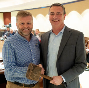 Bill Griffith (right) was presented with the traditional “working man’s gavel” by Immediate Past Chair Jonathan Cade (left), president, Hy-Line International