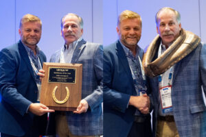 From left: Jonathan Cade, president of Hy-Line International Inc., and outgoing USPOULTRY chair, presenting the Workhorse of the Year plaque and collar to Mike Levengood, vice president, chief animal care officer and farmer relationship advocate for Perdue Farms
