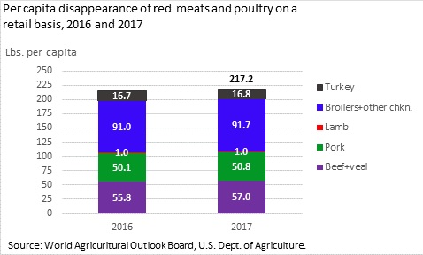 In 2017, per capita disappearance of poultry and red meats on a retail basis is projected to be 217.2 pounds per person, 2.6 pounds more than the 214.6 pounds available per capita last year, according to the USDA report. This year, red meats (beef, pork, veal, and lamb) are expected to make up slightly more than half of disappearance (50.1 percent), while poultry will likely account for slightly less (49.9 percent).