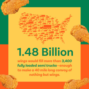Whether you’re rooting for the Patriots or the Seahawks on Sunday, or just watching for the commercials, you’ll probably be doing so while enjoying some wings, helping to contribute to the 1.48 billion NCC is projecting will be eaten this weekend. You’d need more than 3,400 fully loaded semi-trucks to haul them all – enough trucks to make a 40-mile long convoy of nothing but wings!